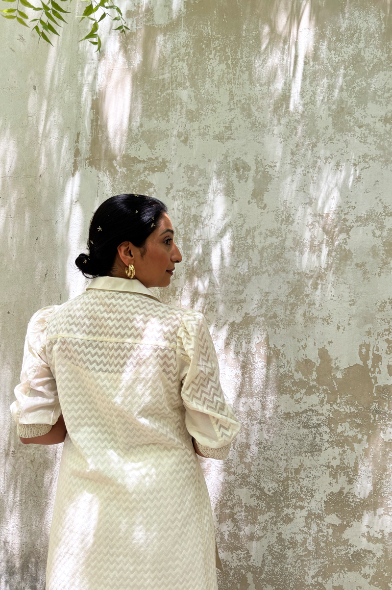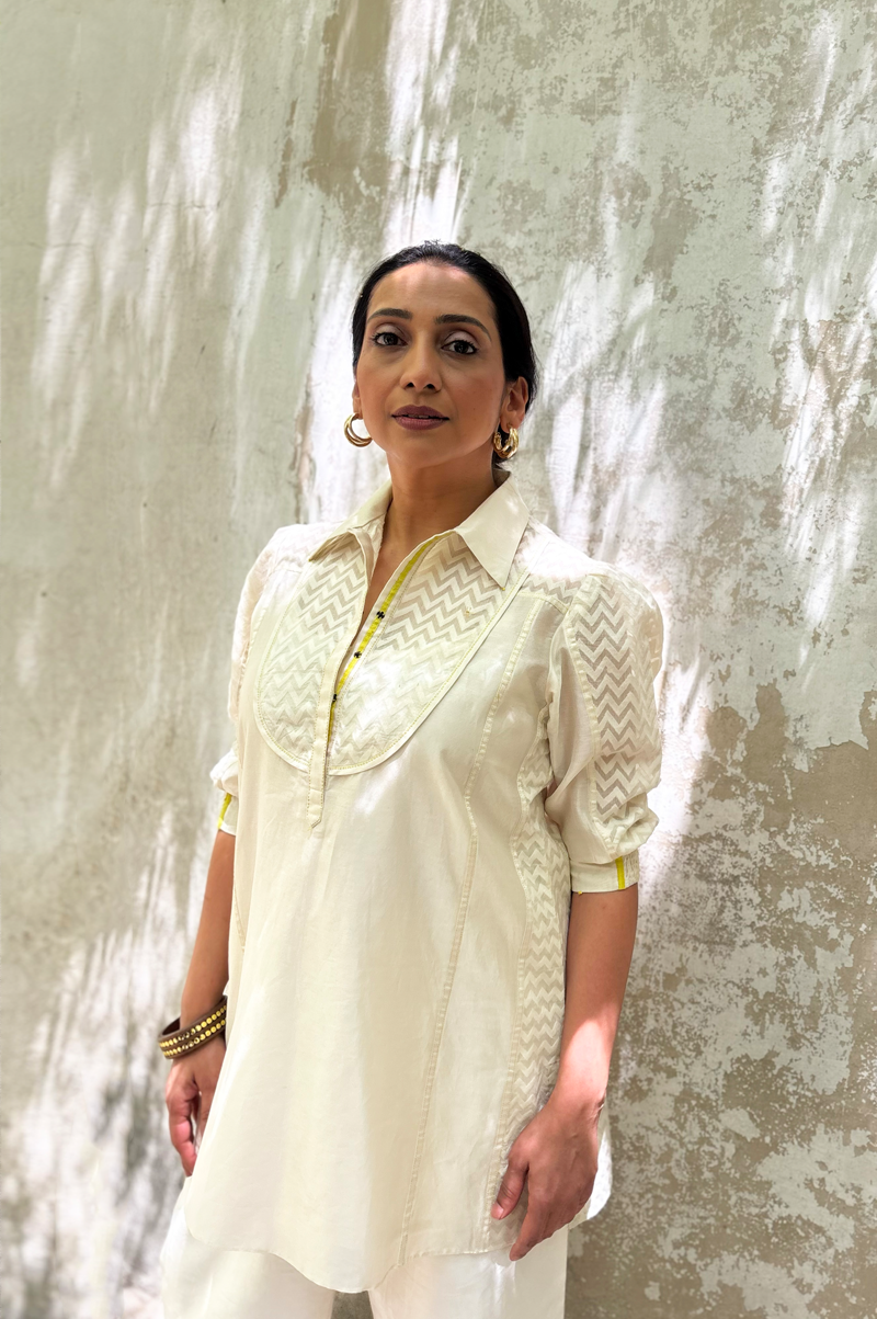 Ivory top that layers solid chanderi with self-woven chevron textures.